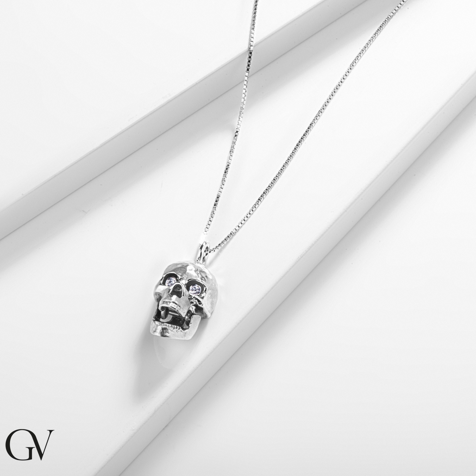 Halskette aus 750er Weißgold mit Totenkopf Anhänger und Diamanten