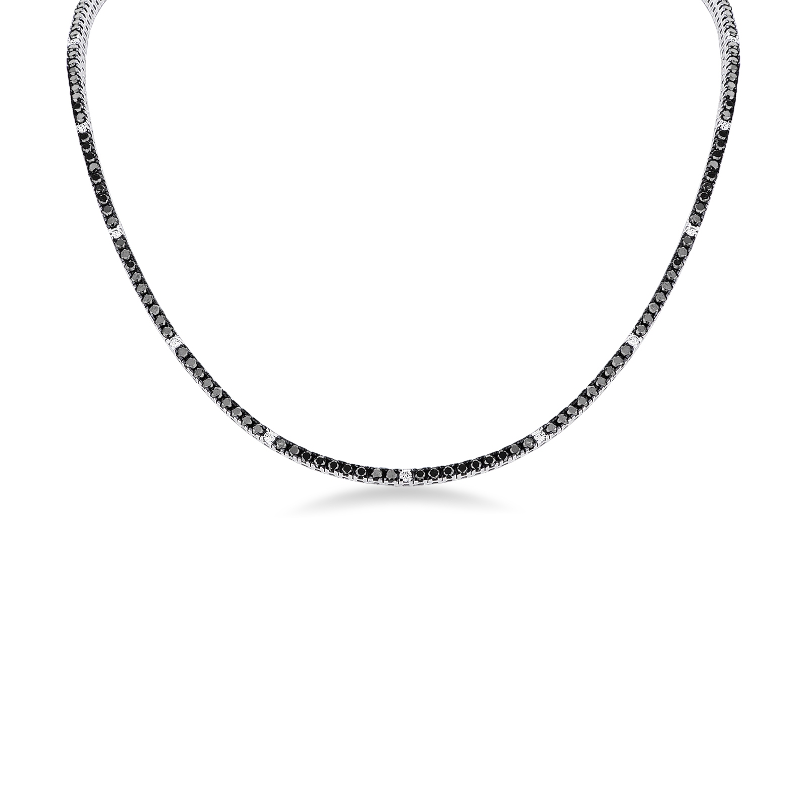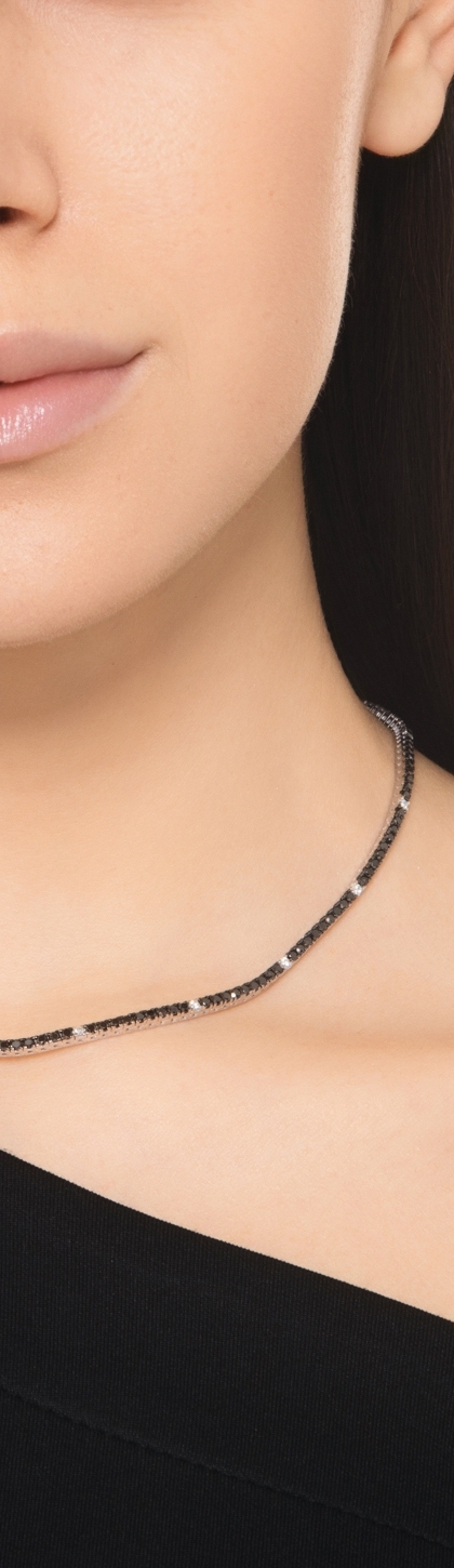 Dieses Tennis-Collier mit schwarzen Diamanten wird durch funkelnde weiße Diamanten aufgelockert, die mit ihren zarten Lichtakzenten den intensiven Farbton der schwarzen Steine elegant unterbrechen.