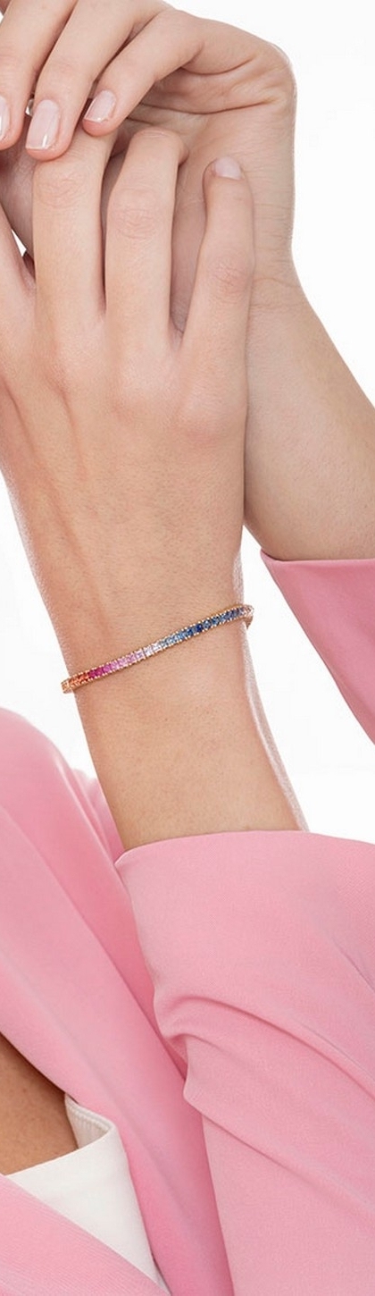Gefertigt aus feinem 18 Karat Gelbgold, präsentiert sich dieses Armband mit einer durchgehenden Reihe von multicolor Saphiren, die in harmonischen Regenbogenfarben leuchten. Die Kombination aus hochwertigem Gelbgold und farbigen Edelsteinen macht dieses Schmuckstück zu einem modernen Klassiker. Das Armband hat ein Glied von etwa 2.5 mm.
