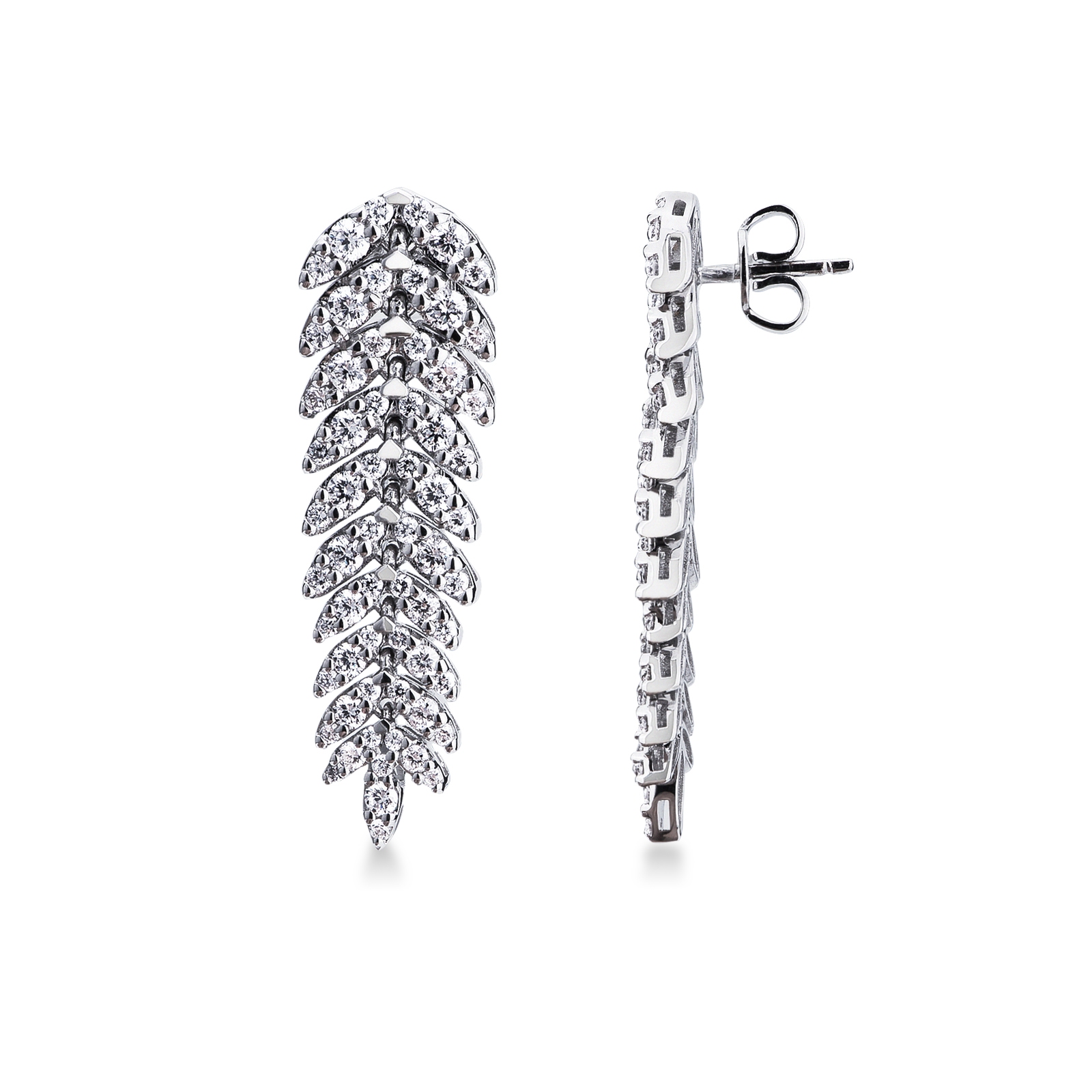 Diese handgefertigten Ohrhänger etwa 3.5 cm lang aus 18 Karat Weißgold verkörpern pure Raffinesse und zeitlose Schönheit. Besetzt mit natürlichen ethischen Diamanten, fangen sie das Licht bei jeder Bewegung ein und verleihen Ihrem Look einen Hauch von Luxus und Eleganz.