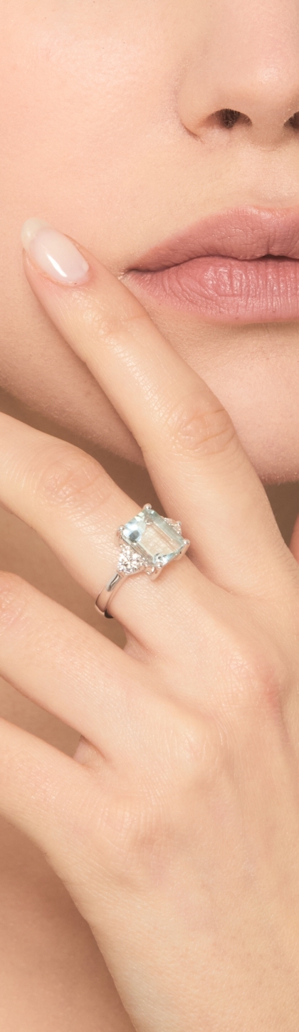Weißgold 18k Damenring mit Aquamarin Smaragdschliff von etwa 10x8 mm und zwei Brillanten, Farbe H, Reinheit VS