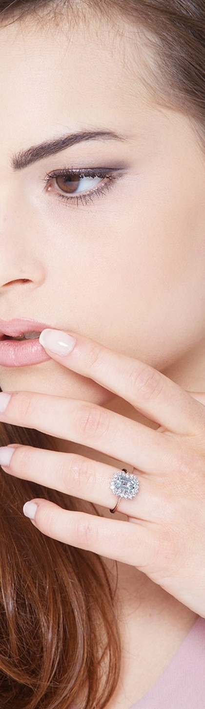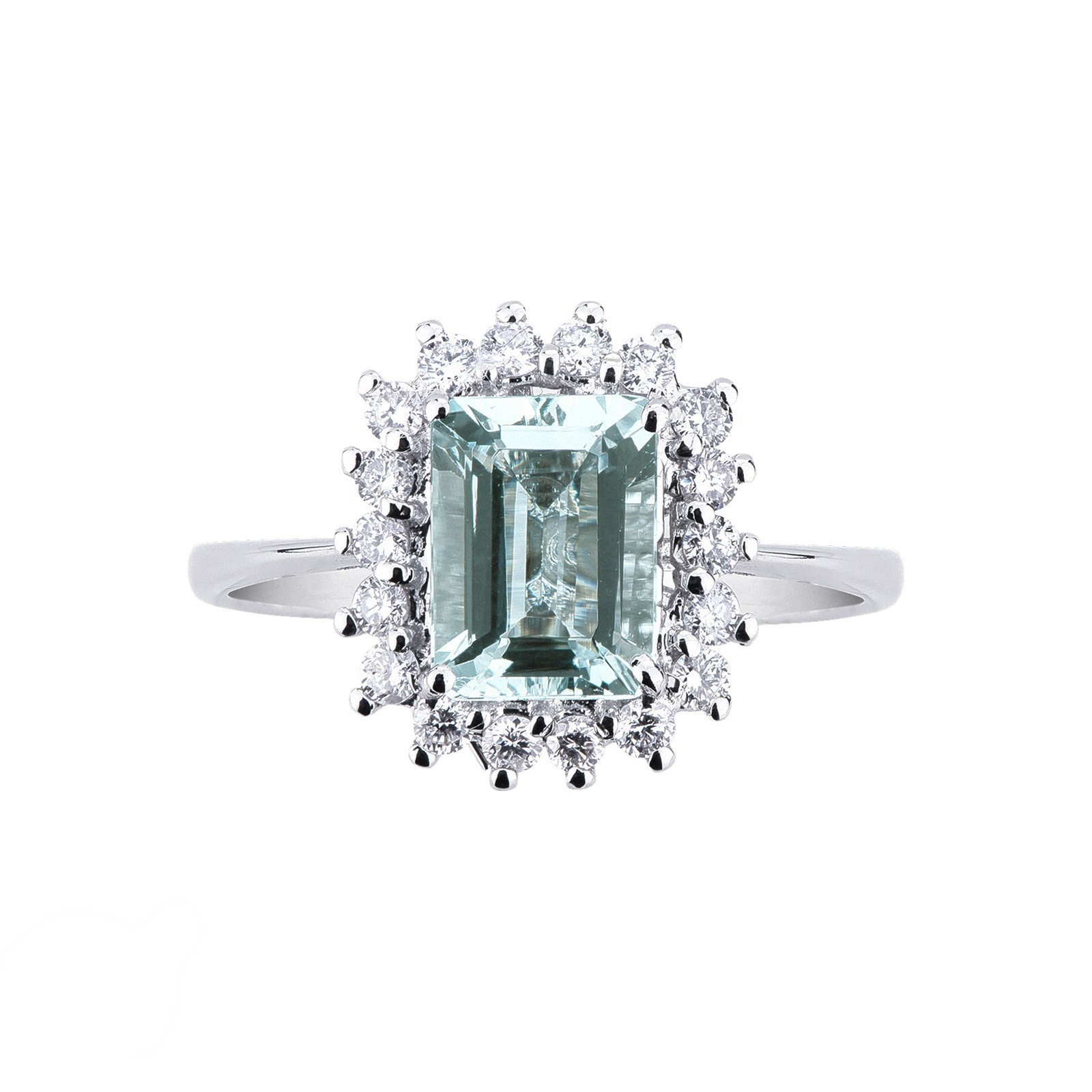Halo Ring aus 18K Weißgold mit Aquamarin Smaragdschliff und Brillanten, Farbe H, Reinheit VS rund um Stein.