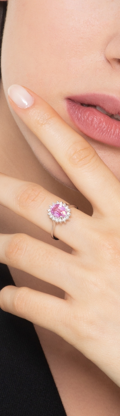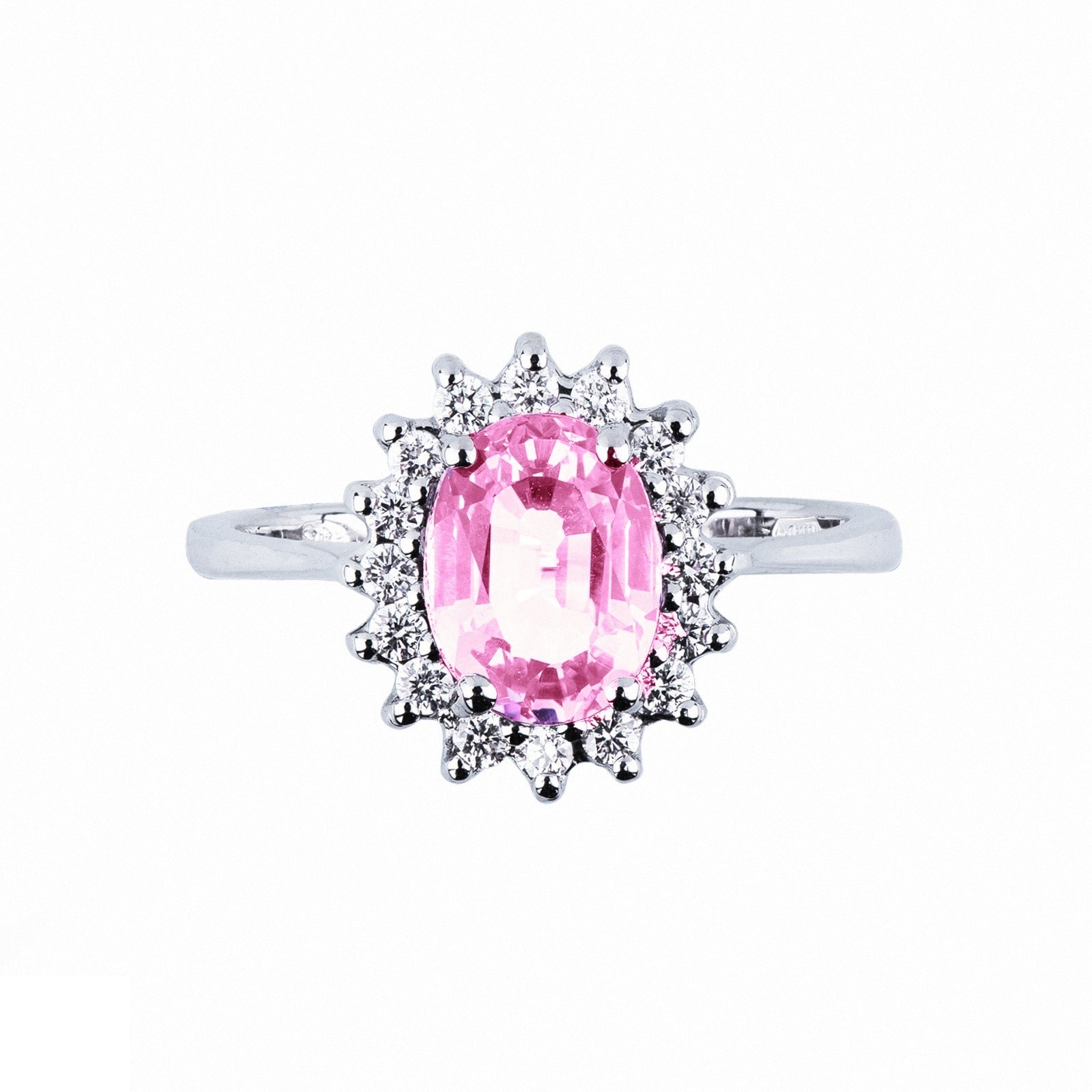 Halo Ring mit rosa Saphir und Diamanten aus Weißgold 18k