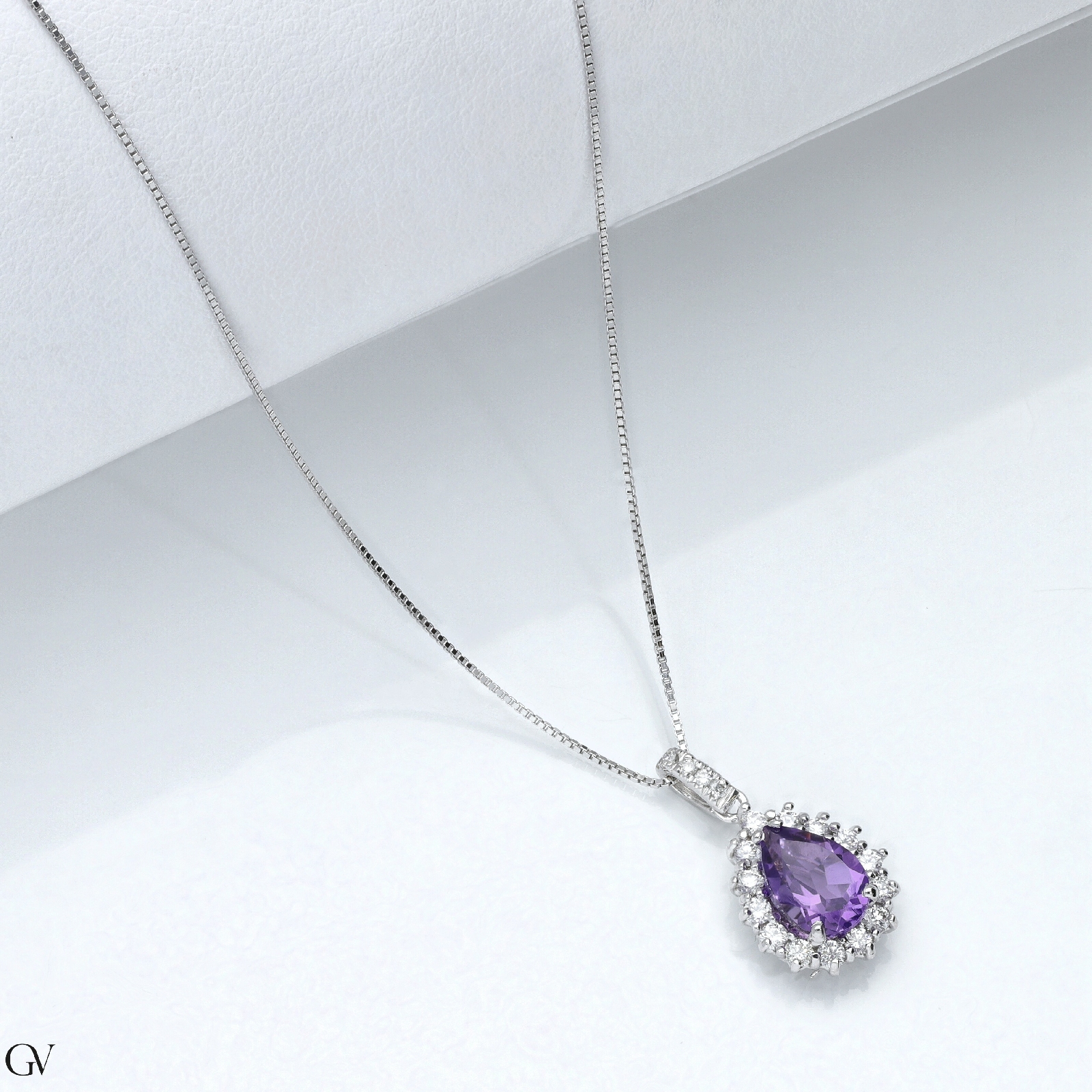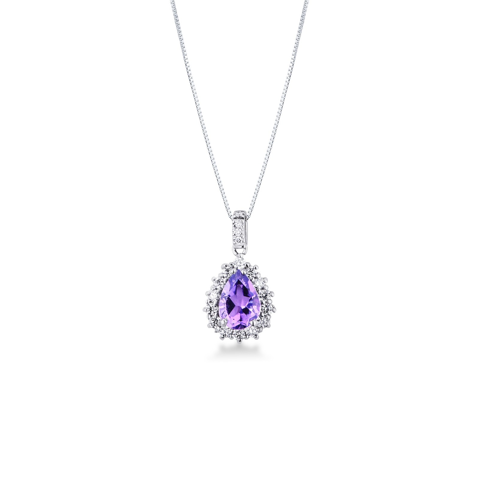 Weißgold 750 Halskette mit Halo Anhänger aus Diamanten und Amethyst