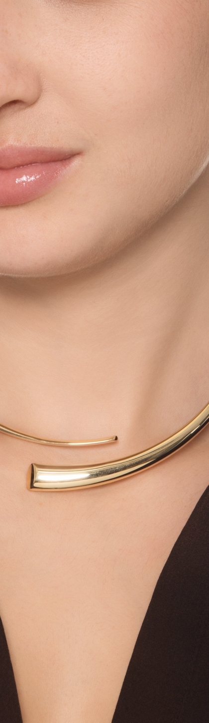 Die starre Form verleiht der Halskette eine raffinierte Struktur, während der warme Glanz des 18 Karat Goldes für ein luxuriöses Finish sorgt.
