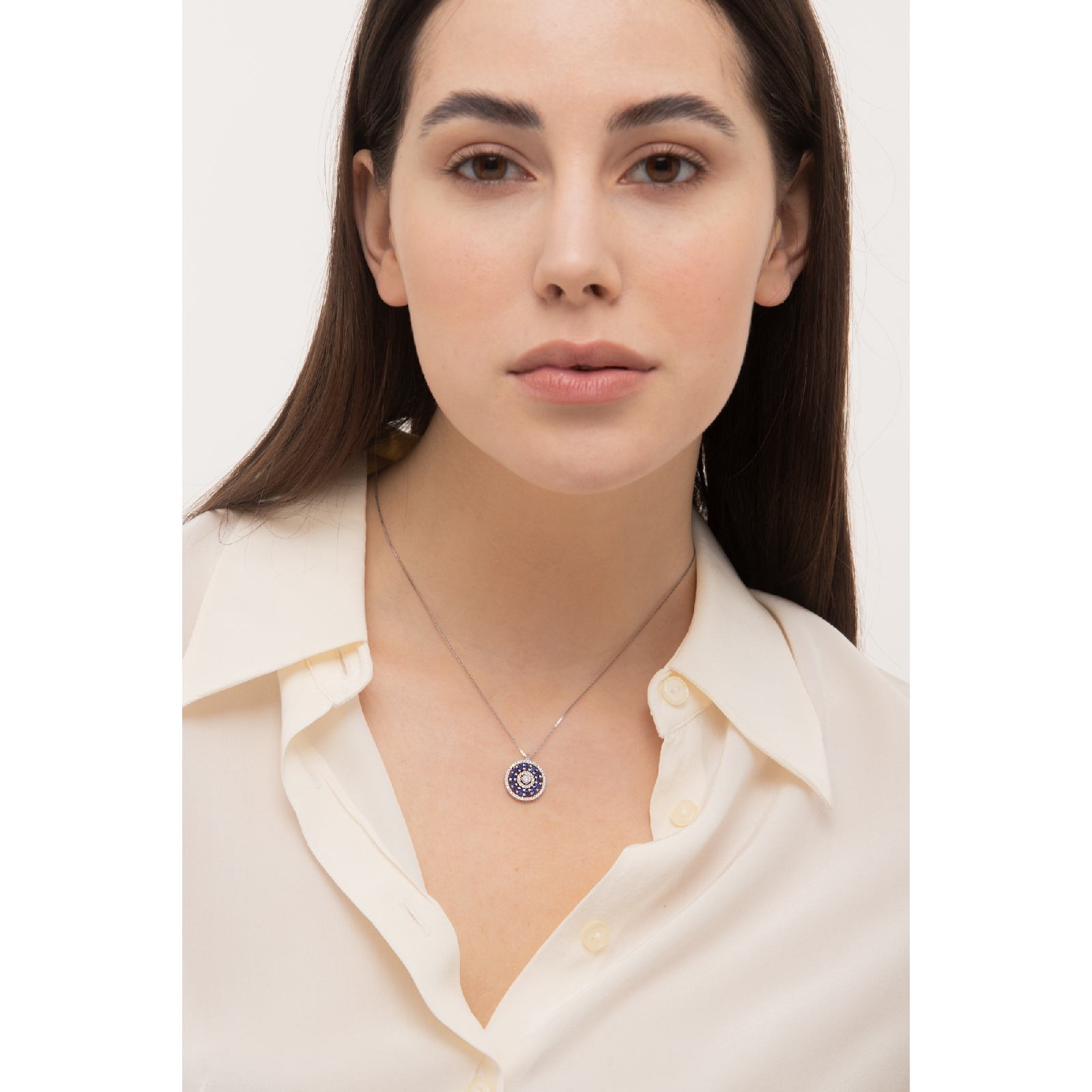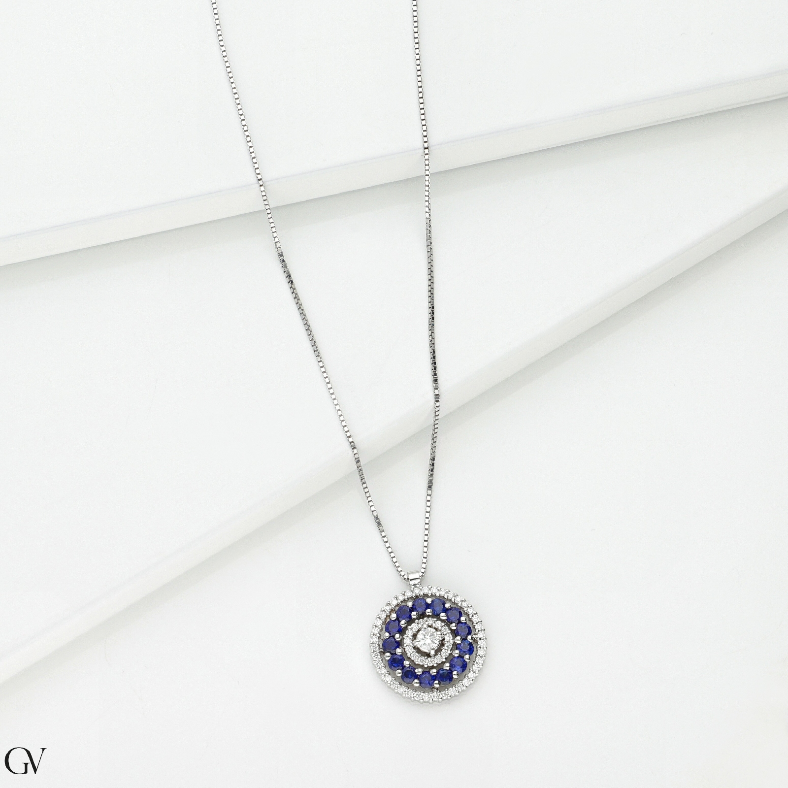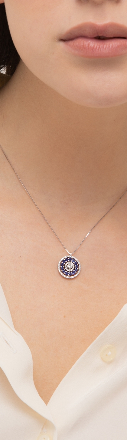 Weißgoldkette mit rundem Anhänger aus Diamanten und Saphiren